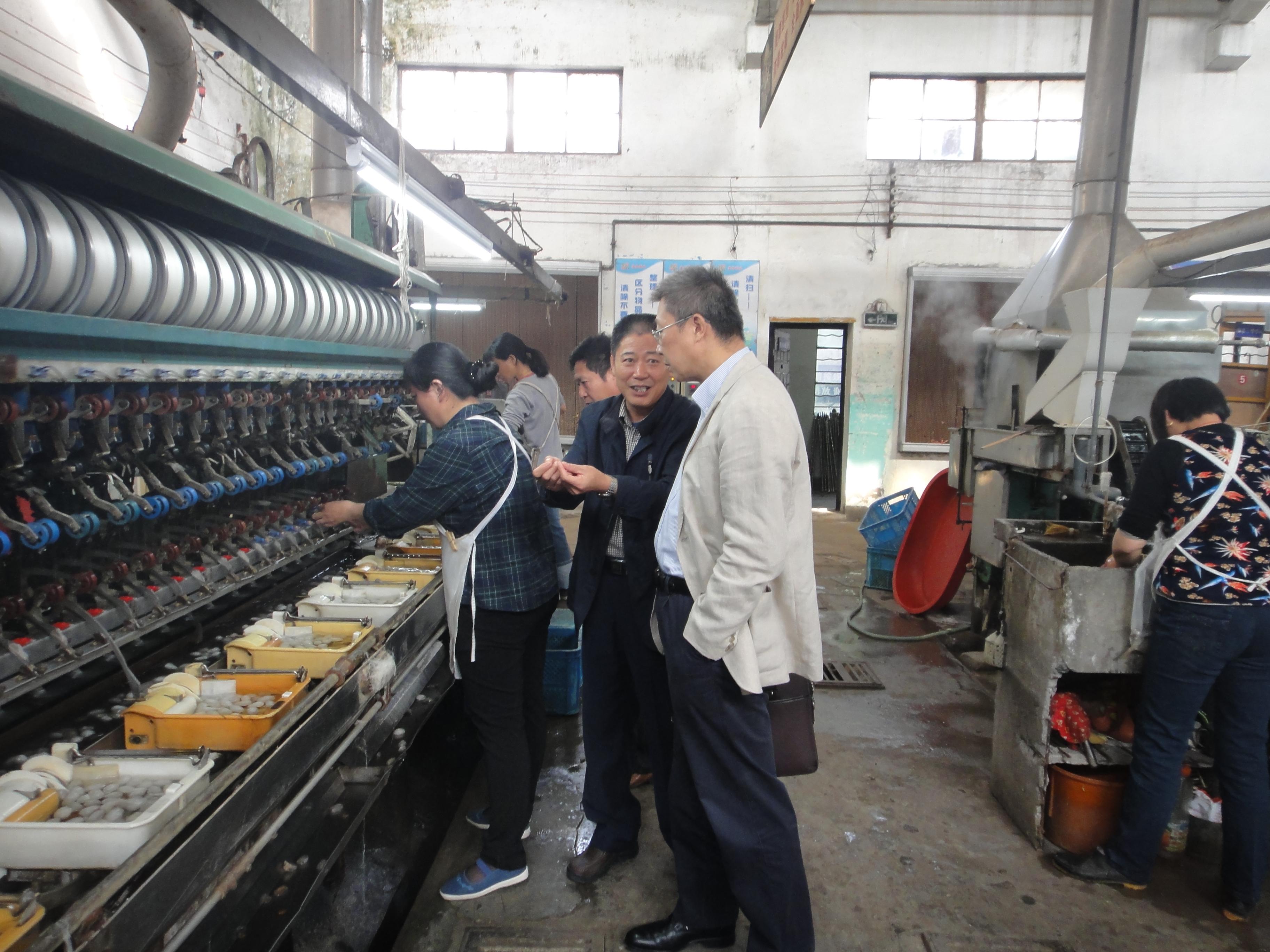 2015年10月27日,江苏省产业技术研究院纺织丝绸技术研究所技术总监吴学东、科研发展部林楚楚来到海安,在海安县物价局季善明局长、吉临兆主任的引荐下参观调研了海安县苏豪制丝有限公司,公司总经理丁忠健热情接待了吴总监等一行。在公司缫丝车间,吴总监细致观察了自动缫丝设备的缫丝过程,吴总监发现缫丝过程中确实大量存在蚕丝断裂的现象,工人需要不停地在设备旁将断裂的蚕丝打结以恢复设备的缫丝操作。丁总表示,由于缫丝工作劳动强度大,工作辛苦,目前除原有缫丝工人外已鲜有人愿意从事缫丝工作,这是目前缫丝行业的首要难题。吴总监指出,目前我们正在研究一种能够自动打结的自动缫丝设备,已经取得了一定的进展,通过本次调研与交流,我们对缫丝机的缫丝原理及工作过程有了更加深刻的认识,定能更好地运用到自动打结缫丝设备的研发上。研究新型自动打结缫丝设备的想法得到丁总的强烈赞许。