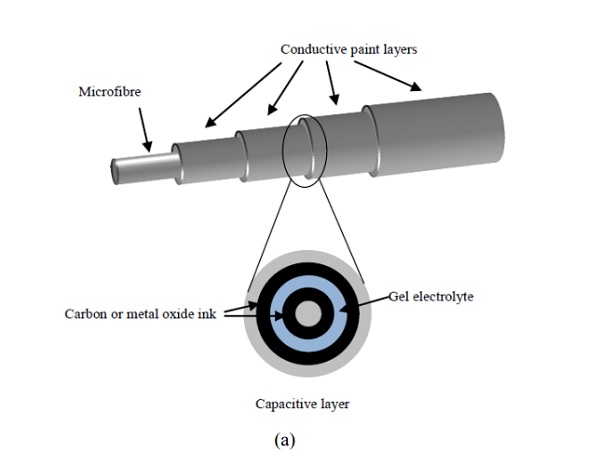 Harrison 教授表示:“超级电容在一般的手机、电脑和平板内,都是很常见的物质,因为不需要经由任何的化学反应就能储存能量,所以能够无限期的充放电。但超级电容若以线型的方式呈现,他们就没有办法突破 1V 电压的限制。”因此,他们的团队研发出一种包覆有两层电容的多层结构,让电压最高输出能达到 2V,突破一般电池只能输出 1.5V 的限制。