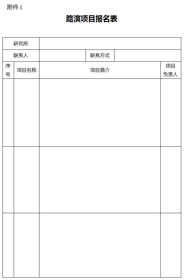 项目路演将以总院技术转移部主办、各专业研究所轮流承办的方式为主,原则上每月一期,每期组织相近领域的专业研究所承办,遴选4-6个技术项目,邀请创投机构和企业参加。请各专业研究所遴选2-3个技术项目,并于2015年12月25日前将路演项目报送至总院技术转移部。总院技术转移部将进行统筹安排,根据技术涉及的领域安排场次和路演时间,在与各专业研究所充分协商后,确定各期负责承办的研究所及主要路演项目。